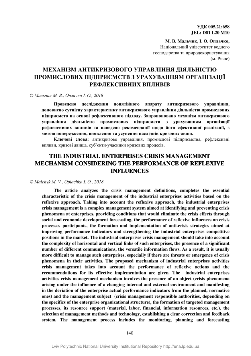 Мальчик М. В. Механізм антикризового управління діяльністю промислових підприємств з урахуванням організації рефлексивних впливів / М. В. Мальчик, І. О. Оплачко // Вісник Національного університету “Львівська політехніка”. Серія: Логістика. — Львів : Видавництво Львівської політехніки, 2018. — № 892. — С. 140–148.