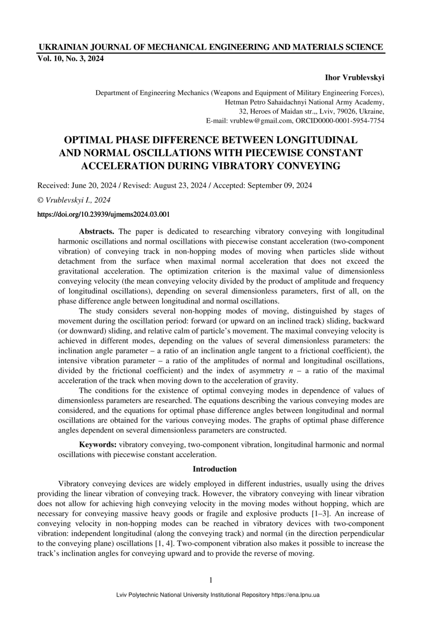 Vrublevskyi I. Optimal phase difference between longitudinal and normal oscillations with piecewise constant acceleration during vibratory conveying / Ihor Vrublevskyi // Ukrainian Journal of Mechanical Engineering and Materials Science. — Lviv : Lviv Politechnic Publishing House, 2024. — Vol 10. — No 3. — P. 1–9.