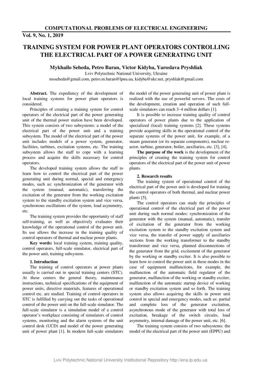 Training system for power plant operators controlling the electrical part of a power generating unit / Mykhailo Seheda, Petro Baran, Victor Kidyba, Yaroslava Pryshliak // Computational Problems of Electrical Engineering. — Lviv : Lviv Politechnic Publishing House, 2019. — Vol 9. — No 1. — P. 33–36.