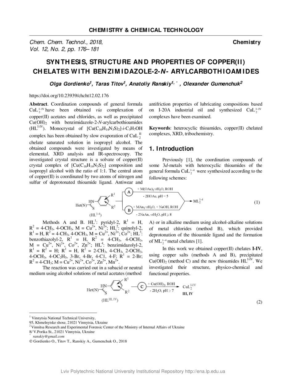 Synthesis, structure and properties of copper(II) chelates with benzimidazole-2-N-arylcarbothioamides / Olga Gordienko, Taras Titov, Anatoliy Ranskiy, Olexander Gumenchuk // Chemistry & Chemical Technology. — Lviv : Lviv Politechnic Publishing House, 2018. — Vol 12. — No 2. — P. 176–181.