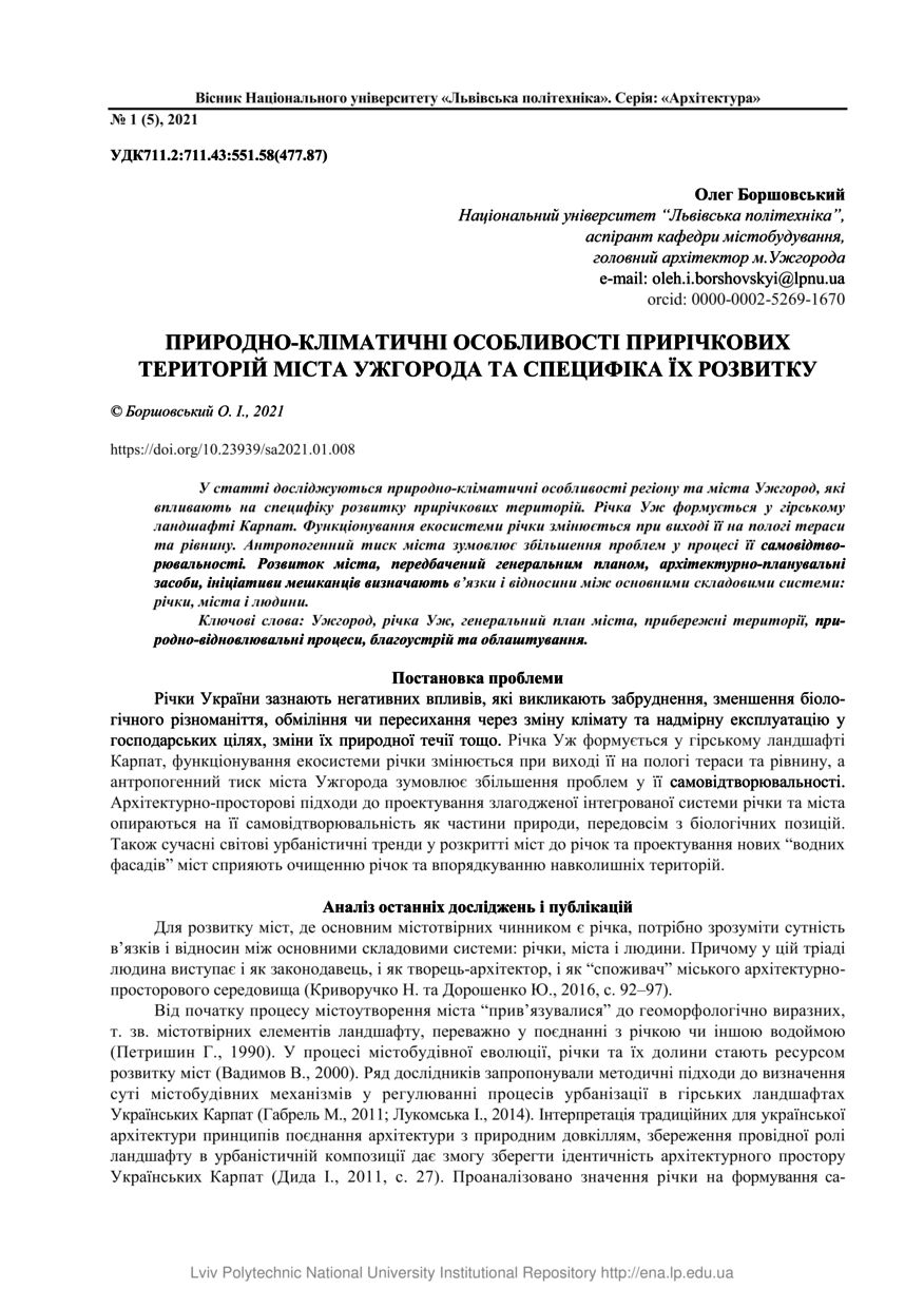 Боршовський О. Природньо-кліматичні особливості прирічкових територій міста Ужгород та специфіка їх розвитку / Олег Боршовський // Вісник Національного університету “Львівська політехніка”. Серія: Архітектура. — Львів : Видавництво Львівської політехніки, 2021. — Том 3 (1). — № 1 (5). — С. 8–16.