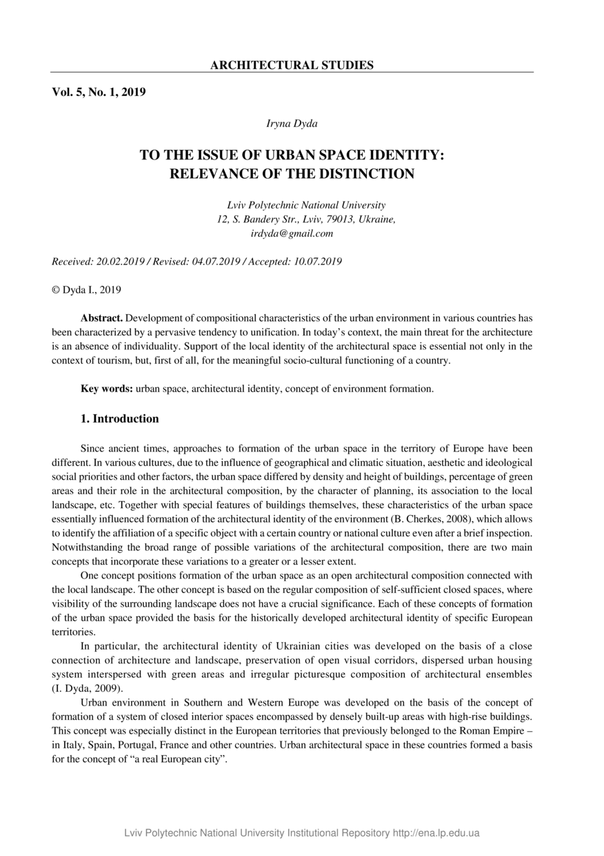 Dyda I. To the issue of urban space identity: relevance of the distinction / Iryna Dyda // Architectural Studies. — Lviv : Lviv Politechnic Publishing House, 2019. — Vol 5. — No 1. — P. 9–17.