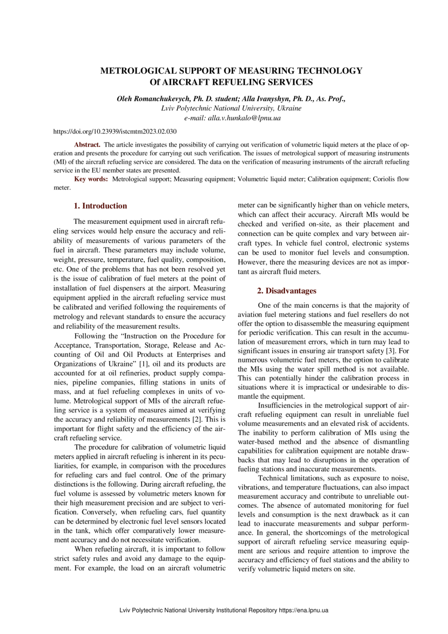 Romanchukevych O. Metrological support of measuring technology of aircraft refueling services / Oleh Romanchukevych, Alla Ivanyshyn // Measuring Equipment and Metrology. — Lviv : Lviv Politechnic Publishing House, 2023. — Vol 84. — No 2. — P. 30–33.