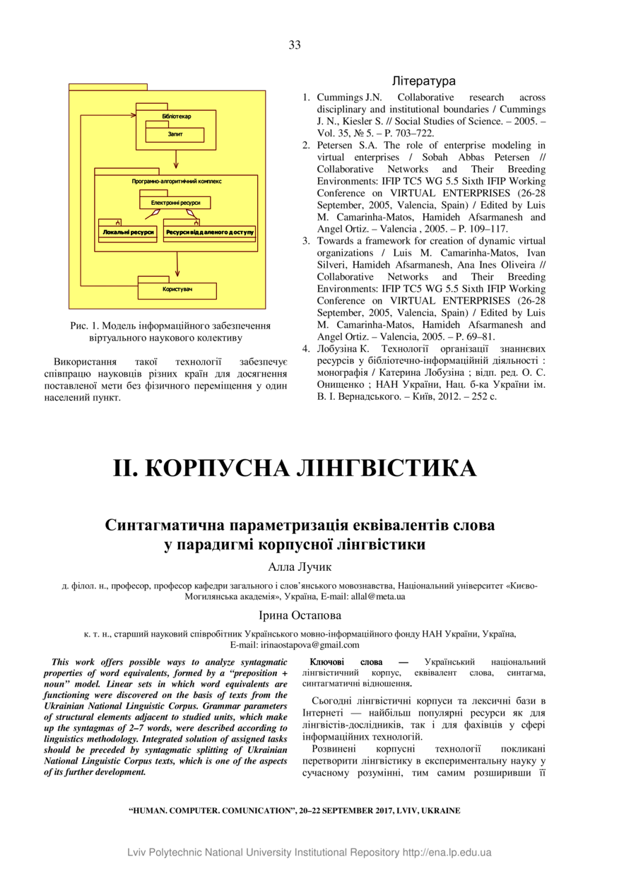 Лучик А. Синтагматична параметризація еквівалентів слова у парадигмі корпусної лінгвістики / Алла Лучик, Ірина Остапова // Людина. Комп’ютер. Комунікація : збірник наукових праць. — Львів : Видавництво Львівської політехніки, 2017. — С. 33–37. — (2. Корпусна лінгвістика).