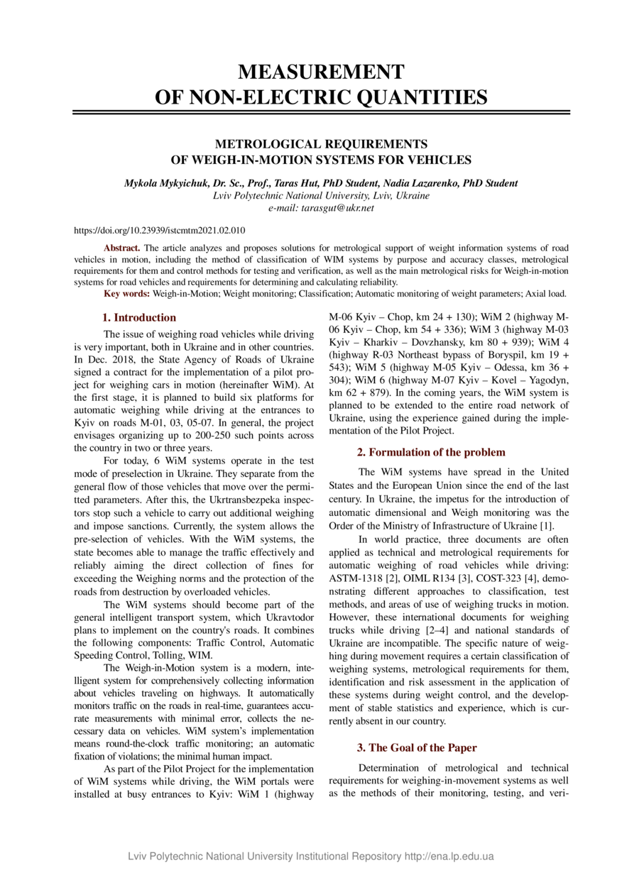 Mykyichuk M. Metrological requirements of weigh-in-motion systems for vehicles / Mykola Mykyichuk, Taras Hut, Nadia Lazarenko // Measuring equipment and metrology. — Lviv : Lviv Politechnic Publishing House, 2021. — Vol 82. — No 2. — P. 10–15.