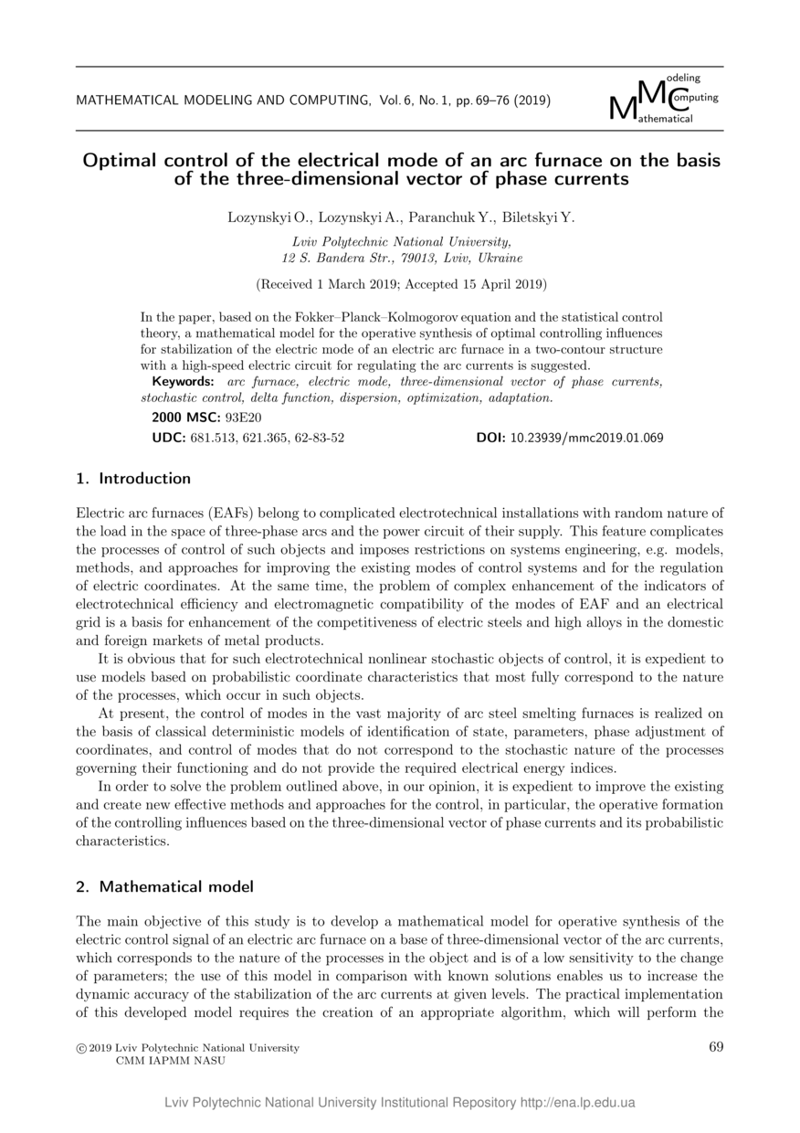 | dc.identifier.citation | Optimal control of the electrical mode of an arc furnace on the basis of the three-dimensional vector of phase currents / O. Lozynskyi, A. Lozynskyi, Y. Paranchuk, Y. Biletskyi // Mathematical Modeling and Computing. — Lviv : Lviv Politechnic Publishing House, 2019. — Vol 6. — No 1. — P. 69–76. | |
