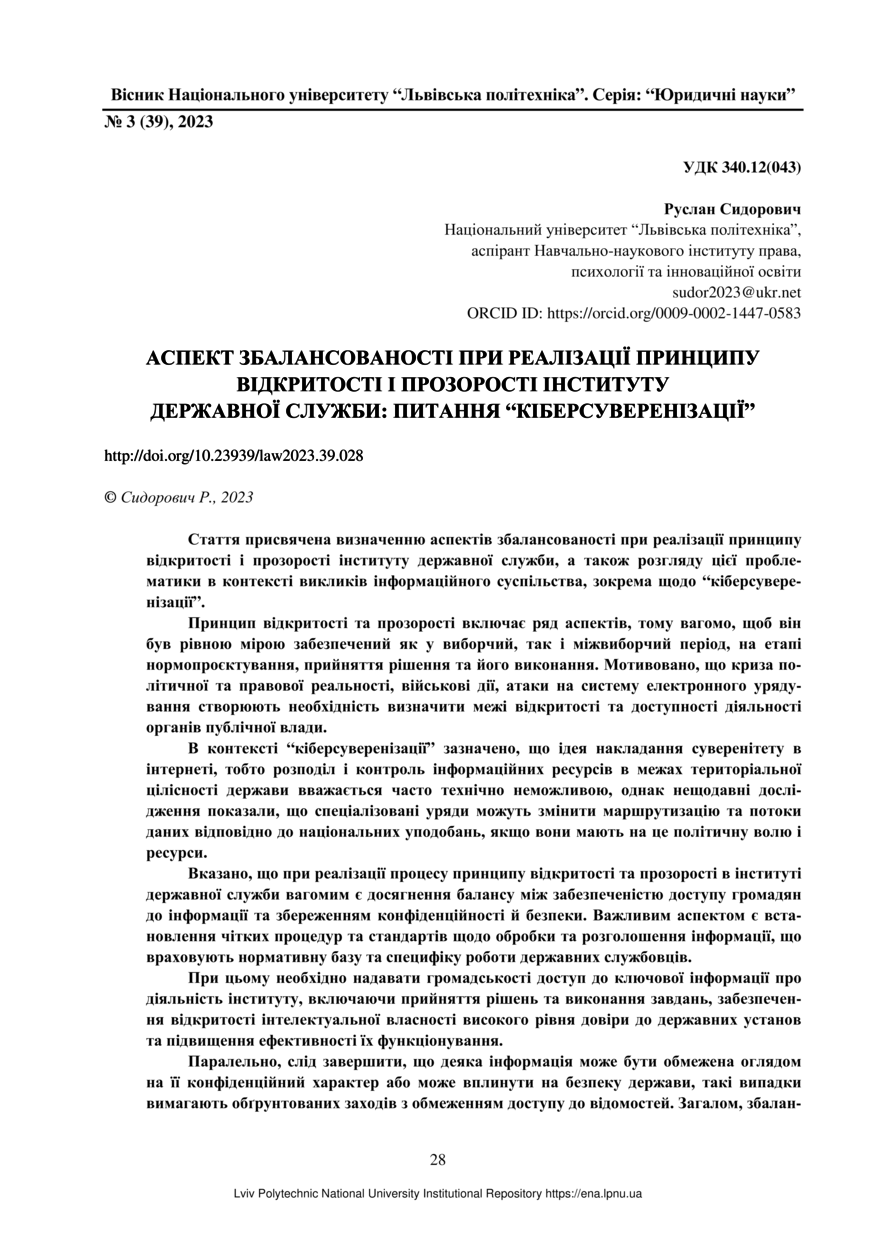 | dc.identifier.citationen | Sydorovych R. The aspect of balance in the implementation of the principle of openness and transparency of the civil service institute: the issue of “Cyber sovereignity” / Ruslan Sydorovych // Visnyk Natsionalnoho universytetu "Lvivska politekhnika". Serie: "Yurydychni nauky". — Lviv : Lviv Politechnic Publishing House, 2023. — No 3 (39). — P. 28–33. | |