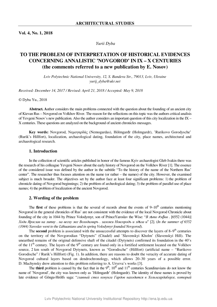 | dc.identifier.citationen | Dyba Y. To the problemof interpretation of historical evidences concerning annalistic ’Novgorod’ in IX – X centuries (the comments referred to a new publication by E. Nosov) / Yurii Dyba // Architectural Studies. — Lviv : Lviv Politechnic Publishing House, 2018. — Vol 4. — No 1. — P. 31–36. | |