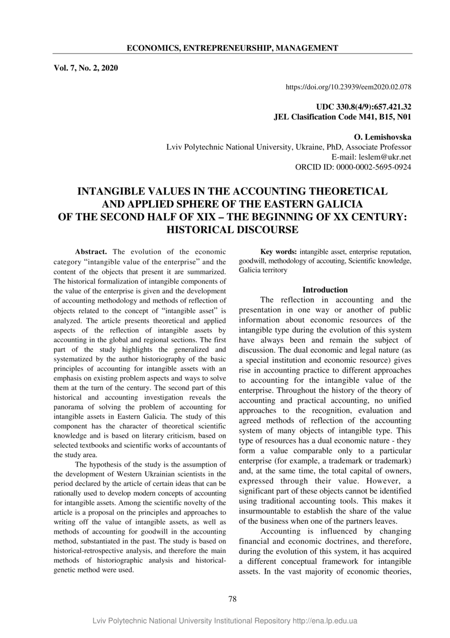 Lemishovska O. Intangible values in the accounting theoretical and applied sphere of the Eastern Galicia of the second half of XIX - the beginning of XX century: historical discourse / O. Lemishovska // Economics, Entrepreneurship, Management. — Lviv : Lviv Politechnic Publishing House, 2020. — Vol 7. — No 2. — P. 78–90.