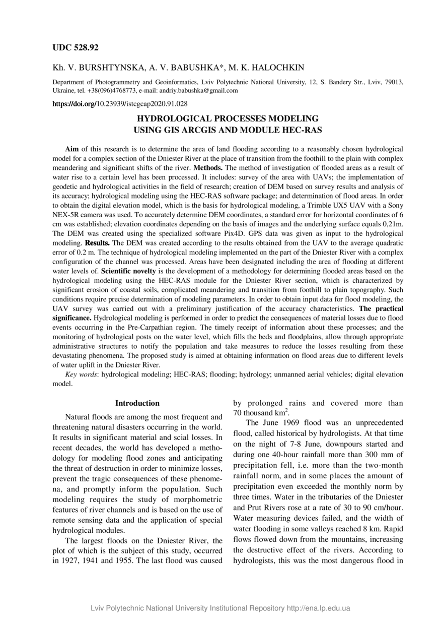 | dc.identifier.citationen | Burshtynska Kh. V. Hydrological processes modeling using GIS ARCGIS and module HEC-RAS / Kh. V. Burshtynska, A. V. Babushka, M. K. Halochkin // Geodesy, cartography and aerial photography. — Lviv : Lviv Politechnic Publishing House, 2020. — No 91. — P. 28–40. | |