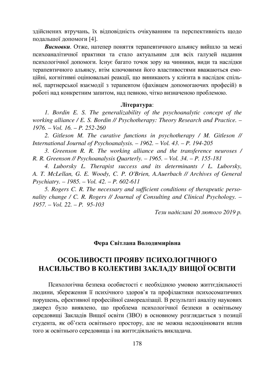 Фера С. В. Особливості прояву психологічного насильство в колективі закладу вищої освіти / Світлана Володимирівна Фера // Психологія національної безпеки і благополуччя особистості : тези І Міжнародної науково-практичної конференції, 14–15 березня 2019 року, Львів. — Львів : Видавництво Львівської політехніки, 2019. — С. 178–180.