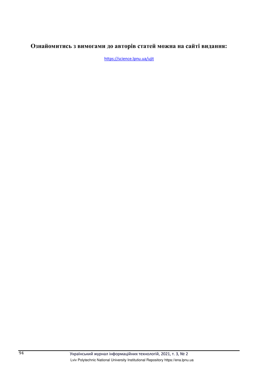 Зміст // Український журнал інформаційних технологій. — Львів : Видавництво Львівської політехніки, 2021. — Том 3. — № 2. — С. 94–98.
