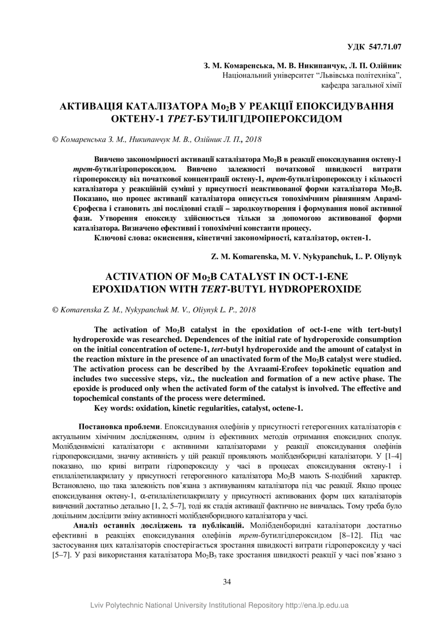 Комаренська З. М. Активація каталізатора Мо2В у реакції епоксидування октену-1 трет-бутилгідропероксидом / З. М. Комаренська, М. В. Никипанчук, Л. П. Олійник // Вісник національного університету “Львівська політехніка”. Серія: Хімія, технологія речовин та їх застосування. — Львів : Видавництво Львівської політехніки, 2018. — № 886. — С. 34–40. — (Аналітична хімія. Фізична та колоїдна хімія. Неорганічна хімія. органічна хімія).