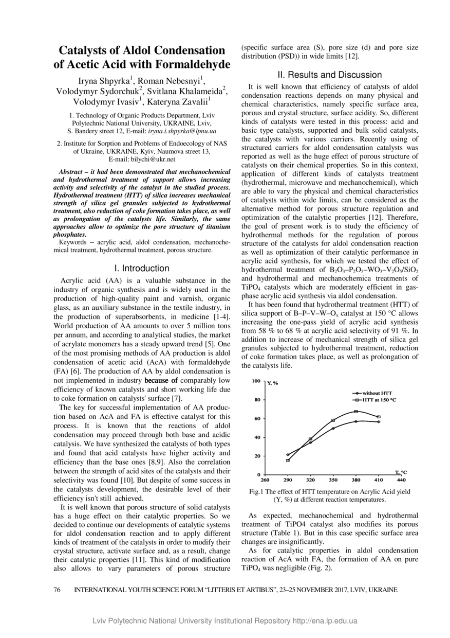 | dc.identifier.citationen | Catalysts of aldol condensation of acetic acid with formaldehyde / Iryna Shpyrka, Roman Nebesnyi, Volodymyr Sydorchuk, Svitlana Khalameida, Volodymyr Ivasiv, Kateryna Zavalii // Litteris et Artibus : proceedings, 23–25 November, 2017. — Lviv : Lviv Polytechnic Publishing House, 2017. — P. 76–77. — (6th International academic conference «Chemistry & chemical technology 2017» (CCT-2017)). | |