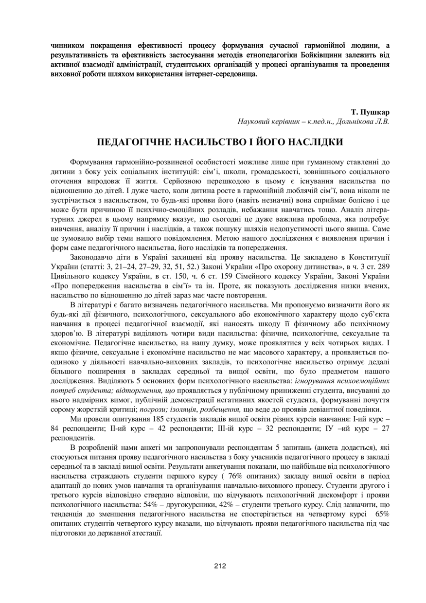 Пушкар Т. Педагогічне насильство і його наслідки / Т. Пушкар, Л. В. Дольнікова // 76-та Студентська науково-технічна конференція. Секція права та психології : збірник тез доповідей, 15–29 жовтня 2018 року, Львів. — Львів : Видавництво Львівської політехніки, 2018. — С. 212–213. — (Педагогіки та соціального управління).
