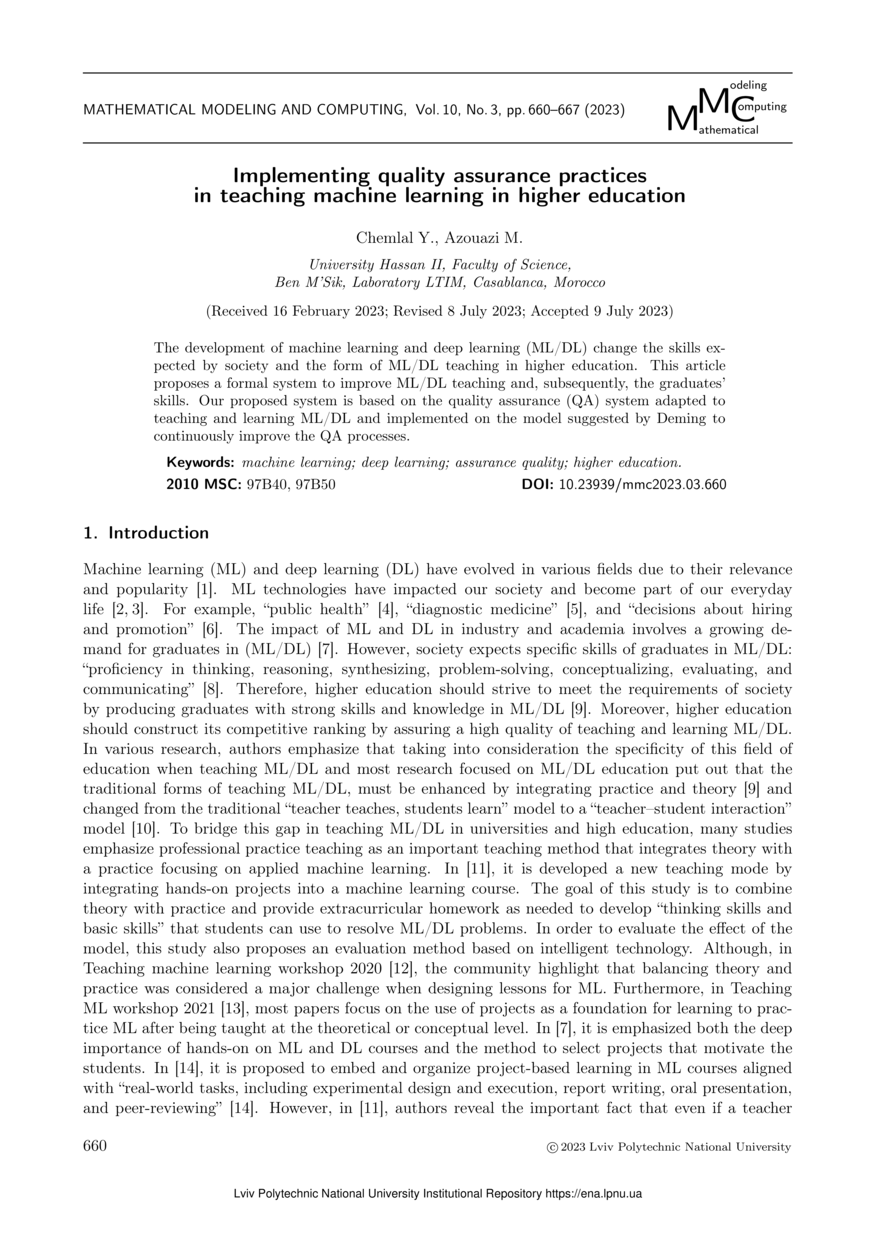 Chemlal Y. Implementing quality assurance practices in teaching machine learning in higher education / Y. Chemlal, M. Azouazi // Mathematical Modeling and Computing. — Lviv : Lviv Politechnic Publishing House, 2023. — Vol 10. — No 3. — P. 660–667.