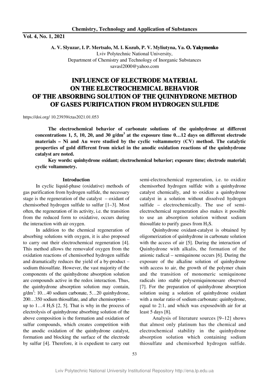 | dc.identifier.citation | Influence of electrode material on the electrochemical behavior of the absorbing solution of the quinhydrone method of gases purification from hydrogen sulfide / A. V. Slyuzar, I. P. Mertsalo, M. I. Kozub, P. V. Myliutyna, Ya. O. Yakymenko // Chemistry, Technology and Application of Substances. — Lviv : Lviv Politechnic Publishing House, 2021. — Vol 4. — No 1. — P. 53–59. | |
