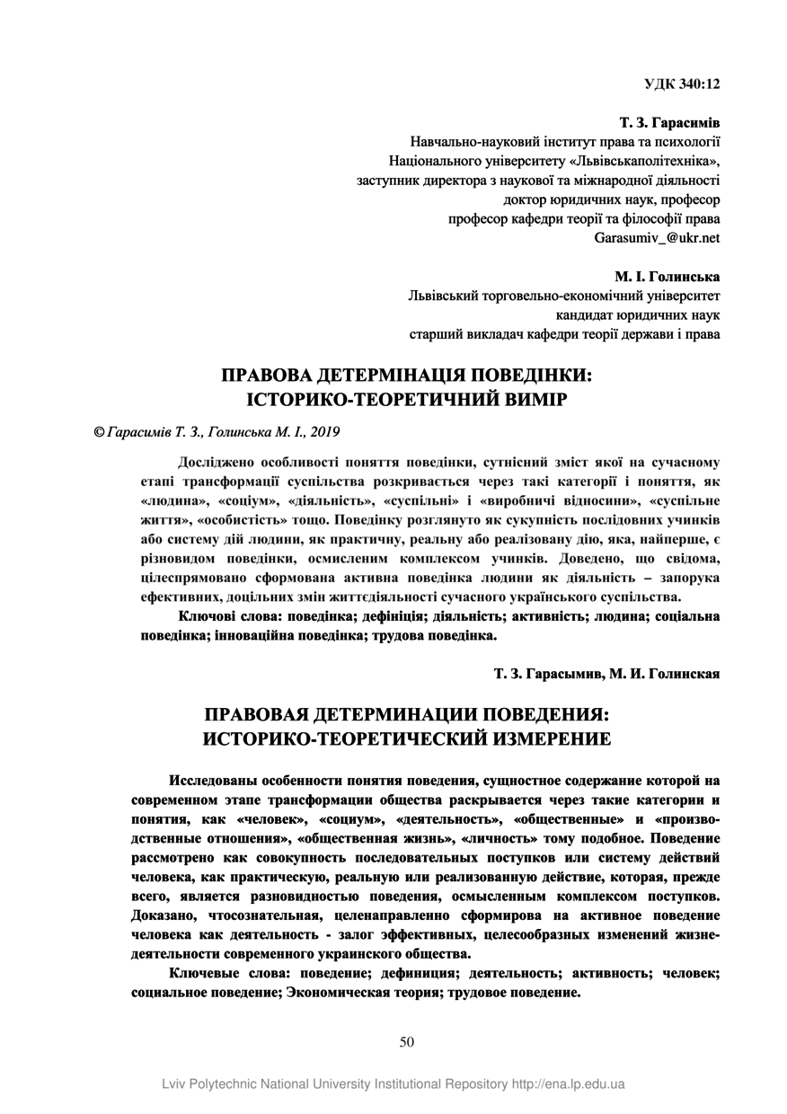 | dc.identifier.citation | Гарасимів Т. З. Правова детермінація поведінки: історико-теоретичний вимір / Т. З. Гарасимів, М. І. Голинська // Вісник Національного університету “Львівська політехніка”. Серія: Юридичні науки. — Львів : Видавництво Львівської політехніки, 2019. — № Випуск 21. — С. 50–54. | |