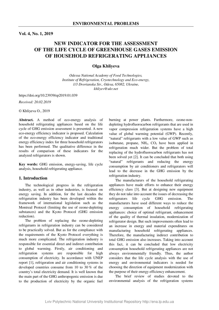 | dc.identifier.citation | Khliyeva O. New indicator for the assessment of the life cycle of greenhouse gases emission of household refrigerating appliances / Olga Khliyeva // Environmental Problems. — Lviv : Lviv Politechnic Publishing House, 2019. — Vol 4. — No 1. — P. 39–44. | |