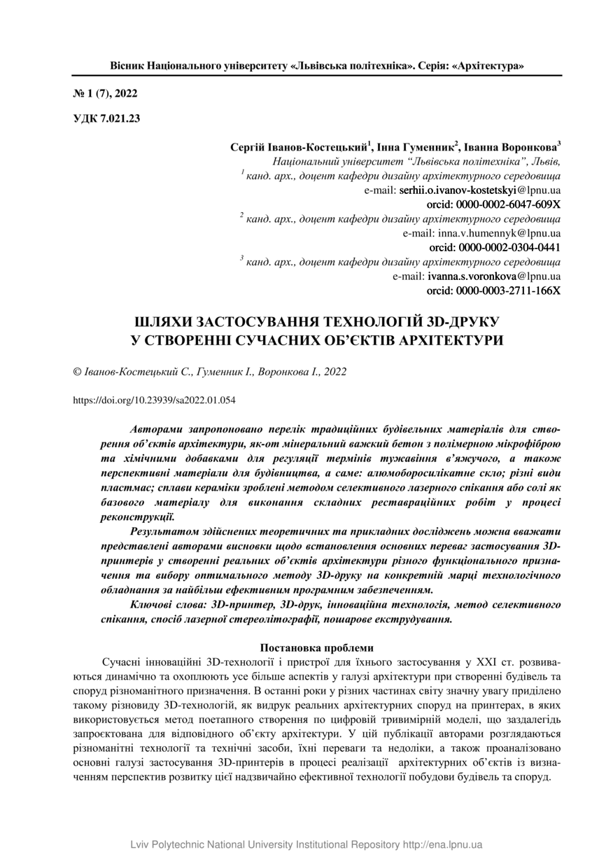 | dc.identifier.citationen | Ivanov-Kostetskyi S. Ways of applying 3d printing technologies in the creation of modern architectural objects / Serhii Ivanov-Kostetskyi, Inna Gumennyk, Ivanna Voronkova // Visnyk Natsionalnoho universytetu "Lvivska politekhnika". Serie: Arkhitektura. — Lviv : Lviv Politechnic Publishing House, 2022. — Vol 4 (1). — No 1 (7). — P. 54–64. | |