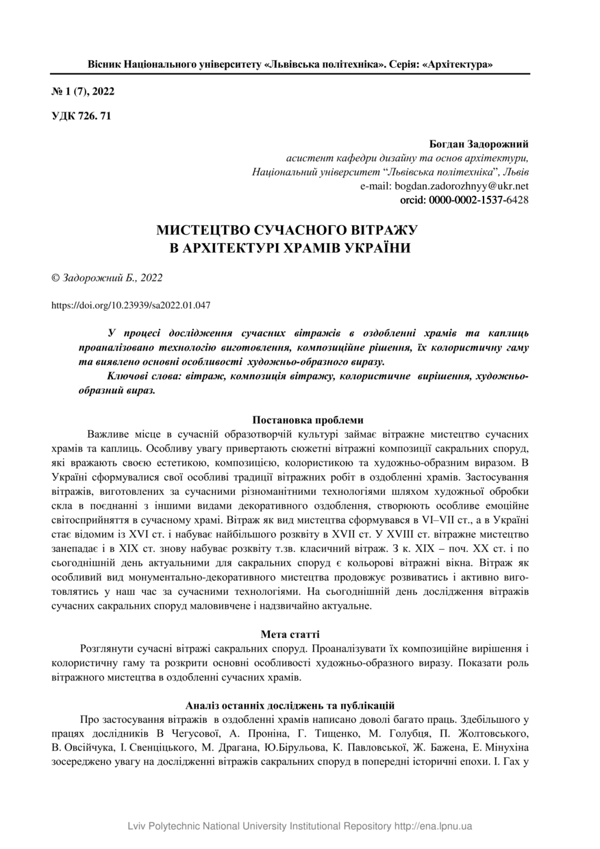 | dc.identifier.citationen | Zadorozhny B. The art of modern stained glass in the architecture of churches of Ukraine / Bogdan Zadorozhny // Visnyk Natsionalnoho universytetu "Lvivska politekhnika". Serie: Arkhitektura. — Lviv : Lviv Politechnic Publishing House, 2022. — Vol 4 (1). — No 1 (7). — P. 47–53. | |