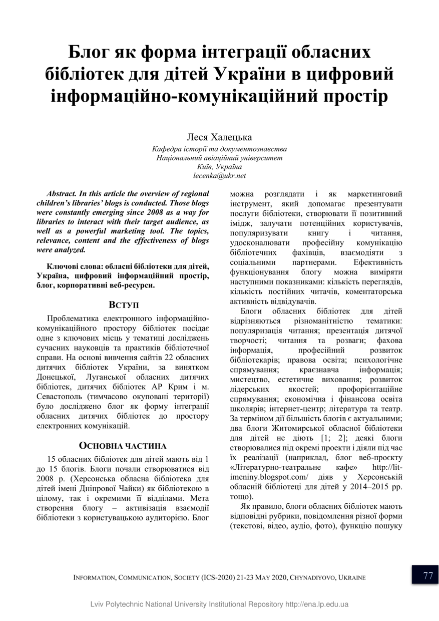 Халецька Л. Блог як форма інтеграції обласних бібліотек для дітей України в цифровий інформаційно-комунікаційний простір / Леся Халецька // Інформація, комунікація, суспільство 2020 : матеріали 9-ї Міжнародної наукової конференції, 21–23 травня 2020 року, Львів. — Львів : Видавництво Львівської політехніки, 2020. — С. 77–78. — (Бібліотечна, архівна та музейна діяльність в умовах розвитку інформаційного суспільства).