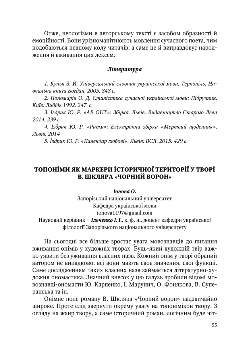 Ільченко І. І. Топоніми як маркери історичної території у творі В. Шкляра «Чорний ворон» / І. І. Ільченко, І. І. Ільченко // Українська мова в просторі й часі : матеріали Всеукраїнської студентської науково-практичної конференції, 17–19 квітня 2019 року, Львів. — Львів : Видавництво Львівської політехніки, 2019. — С. 55–57. — (Лексико-семантичні особливості художньо-публіцистичного мовлення).