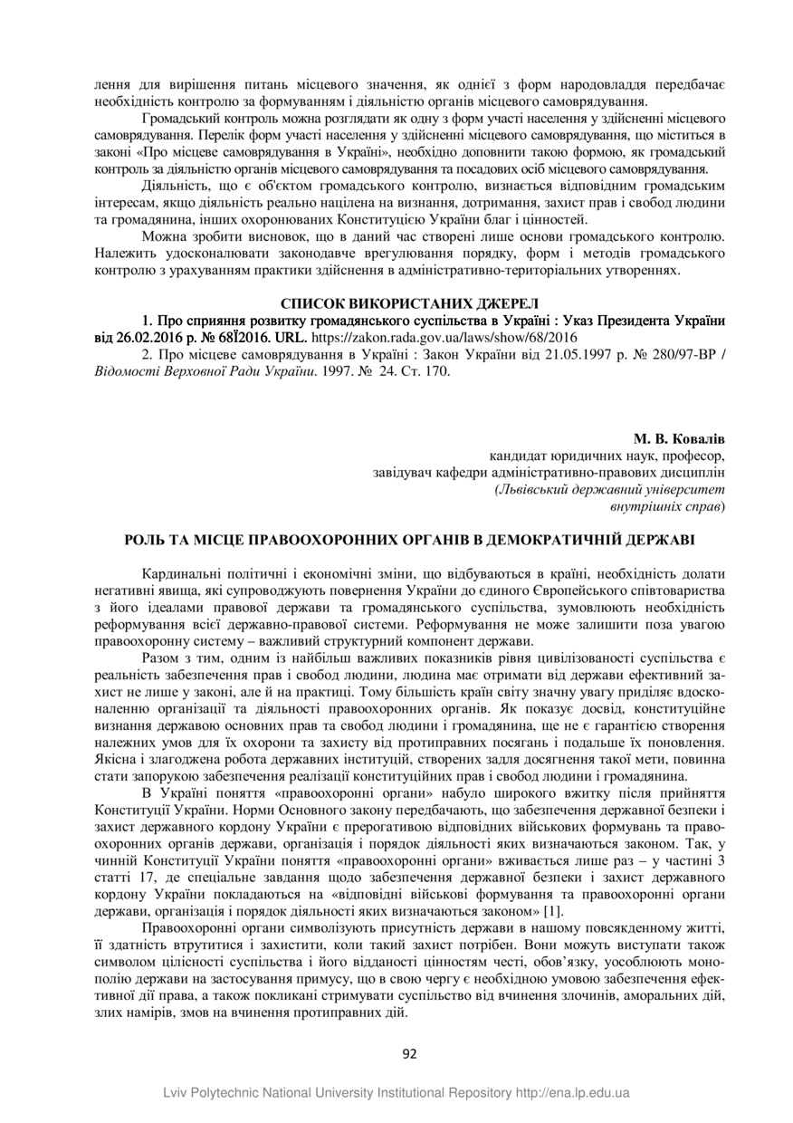 Ковалів М. В. Роль та місце правоохоронних органів в демократичній державі / М. В. Ковалів // Захист прав і свобод людини та громадянина в умовах формування правової держави : збірник тез ІХ Всеукраїнської науково-практичної конференції, 30 травня 2020 року, Львів. — Львів : Видавництво Львівської політехніки, 2020. — С. 92–93. — (Адміністративно-правові аспекти захисту прав і свобод людини та громадянина в умовах формування правової держави).