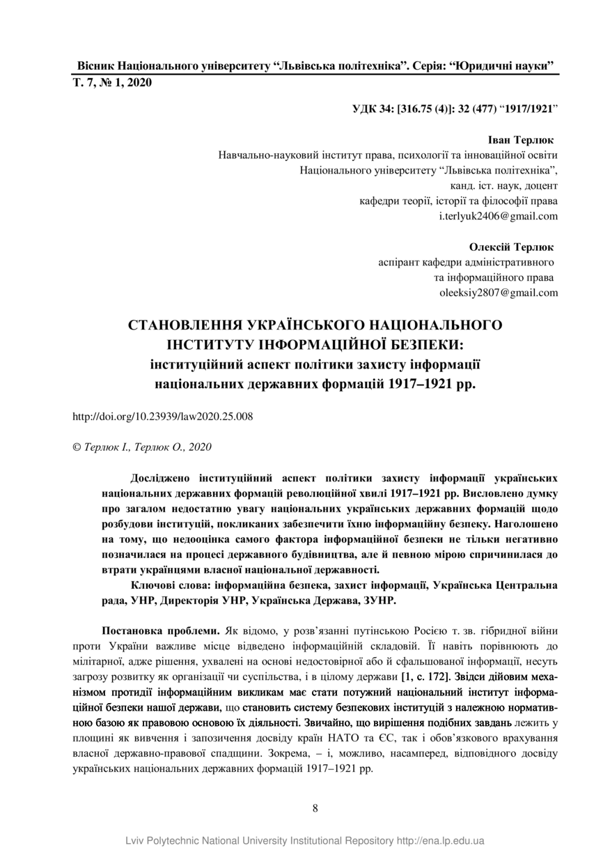 | dc.identifier.citationen | Terlyuk I. Establishment of the ukrainian national institute of information security: institutional aspect of information security policyof national state formations of 1917–1921 / Ivan Terlyuk, Oleksiy Terlyuk // Visnyk Natsionalnoho universytetu "Lvivska politekhnika". Serie: Yurydychni nauky. — Lviv : Lviv Politechnic Publishing House, 2020. — Vol 7. — No 1. — P. 8–14. | |
