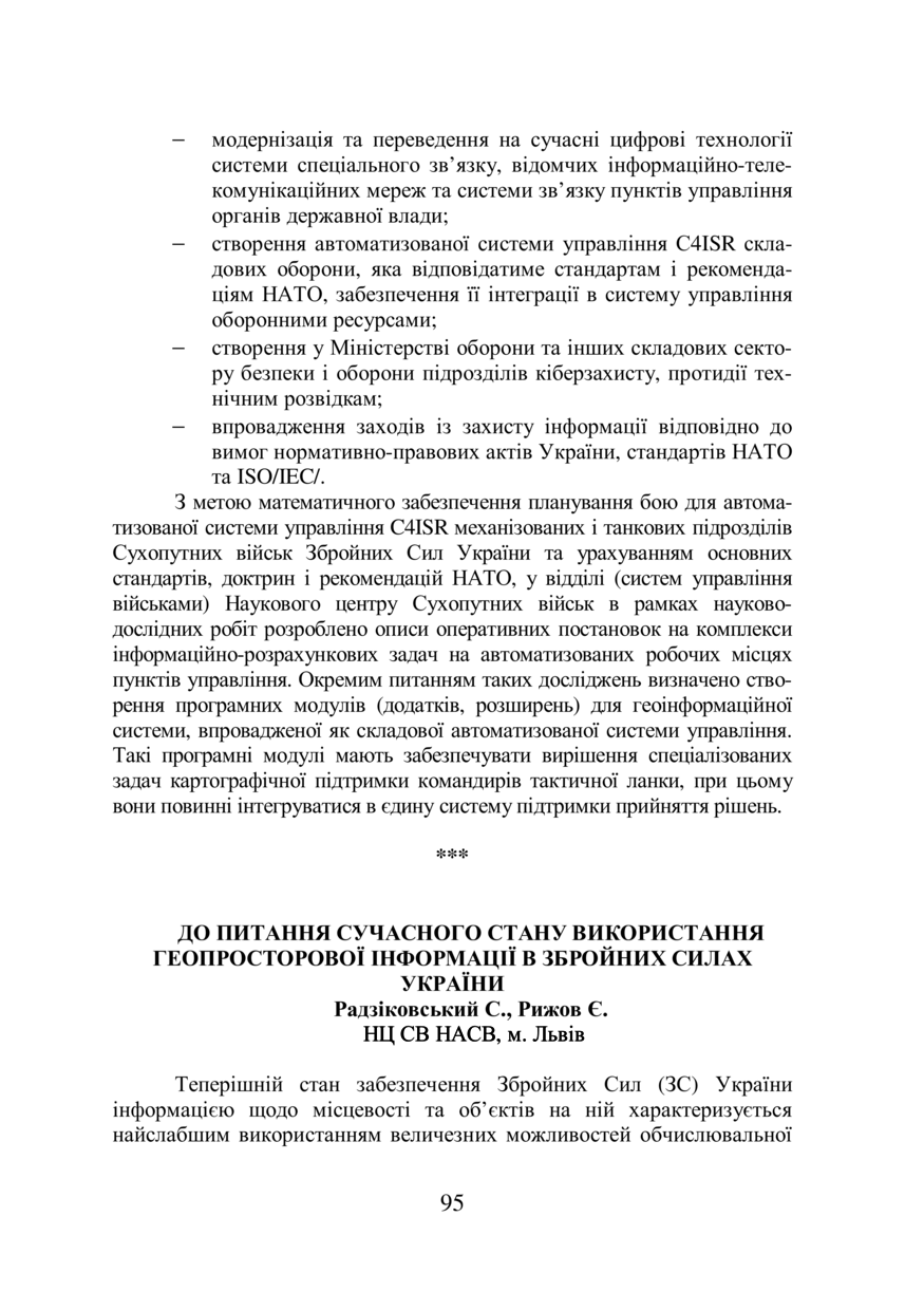 Радзіковський С. До питання сучасного стану використання геопросторової інформації в Збройних Силах України / С. Радзіковський, Є. Рижов // GEOFORUM’2019 : тези доповідей 24 Міжнародної науково-технічної конференції, 10–12 квітня 2019 року, Львів. — Львів : Видавництво Львівської політехніки, 2019. — С. 95–97.