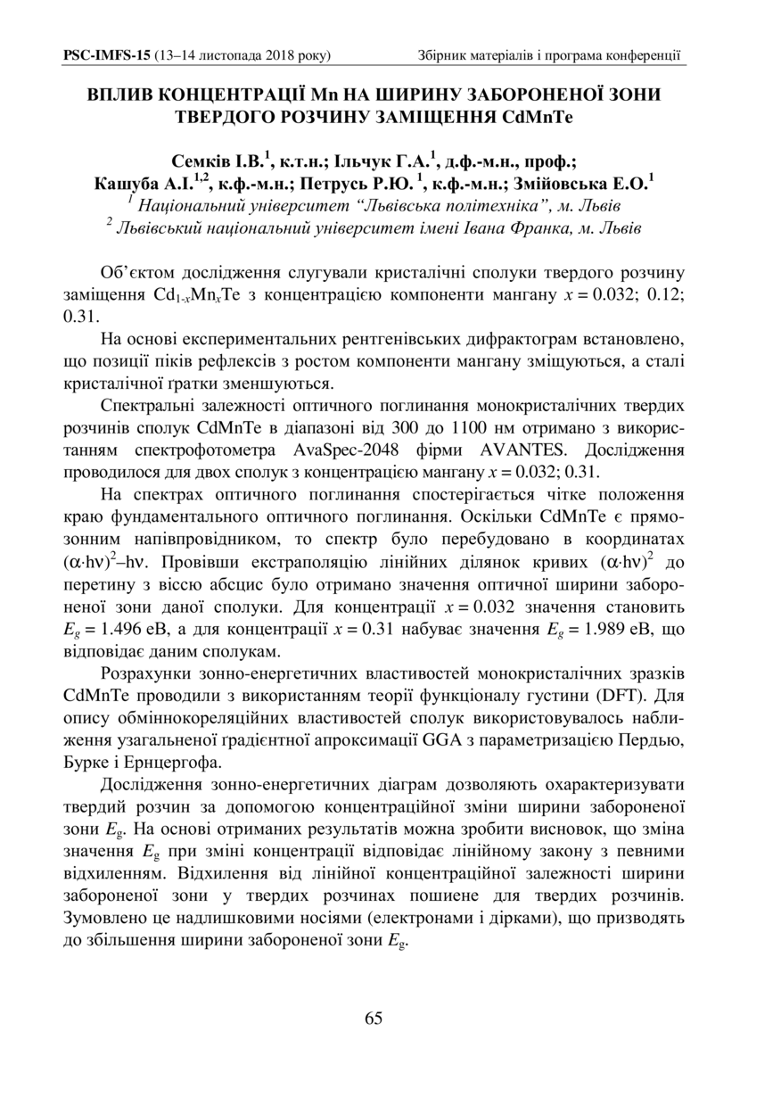 Вплив концентрації Mn на ширину забороненої зони твердого розчину заміщення CdMnTe / І. В. Семків, Г. А. Ільчук, А. І. Кашуба, Р. Ю. Петрусь, Е. О. Змійовська // 15-та Відкрита наукова конференція Інституту прикладної математики та фундаментальних наук (ІМФН) : збірник матеріалів і програма конференції, 13–14 листопада 2018 року, Львів. — Львів : Видавництво Львівської політехніки, 2018. — С. 65. — (Теоретична і експериментальна фізика).
