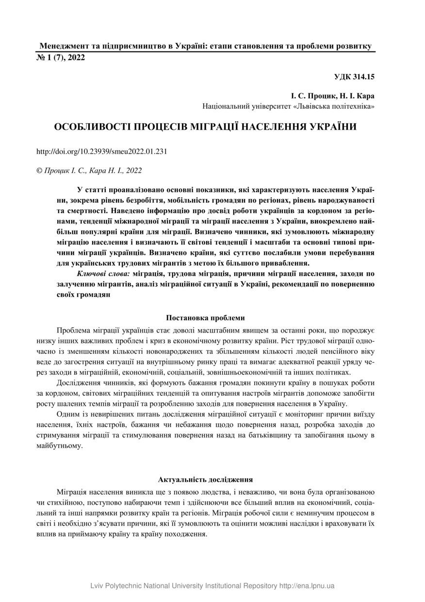 | dc.identifier.citation | Процик І. С. Особливості процесів міграції населення України / І. С. Процик, Н. І. Кара // Менеджмент та підприємництво в Україні: етапи становлення і проблеми розвитку. — Львів : Видавництво Львівської політехніки, 2022. — Том 4. — № 1. — С. 231–240. | |