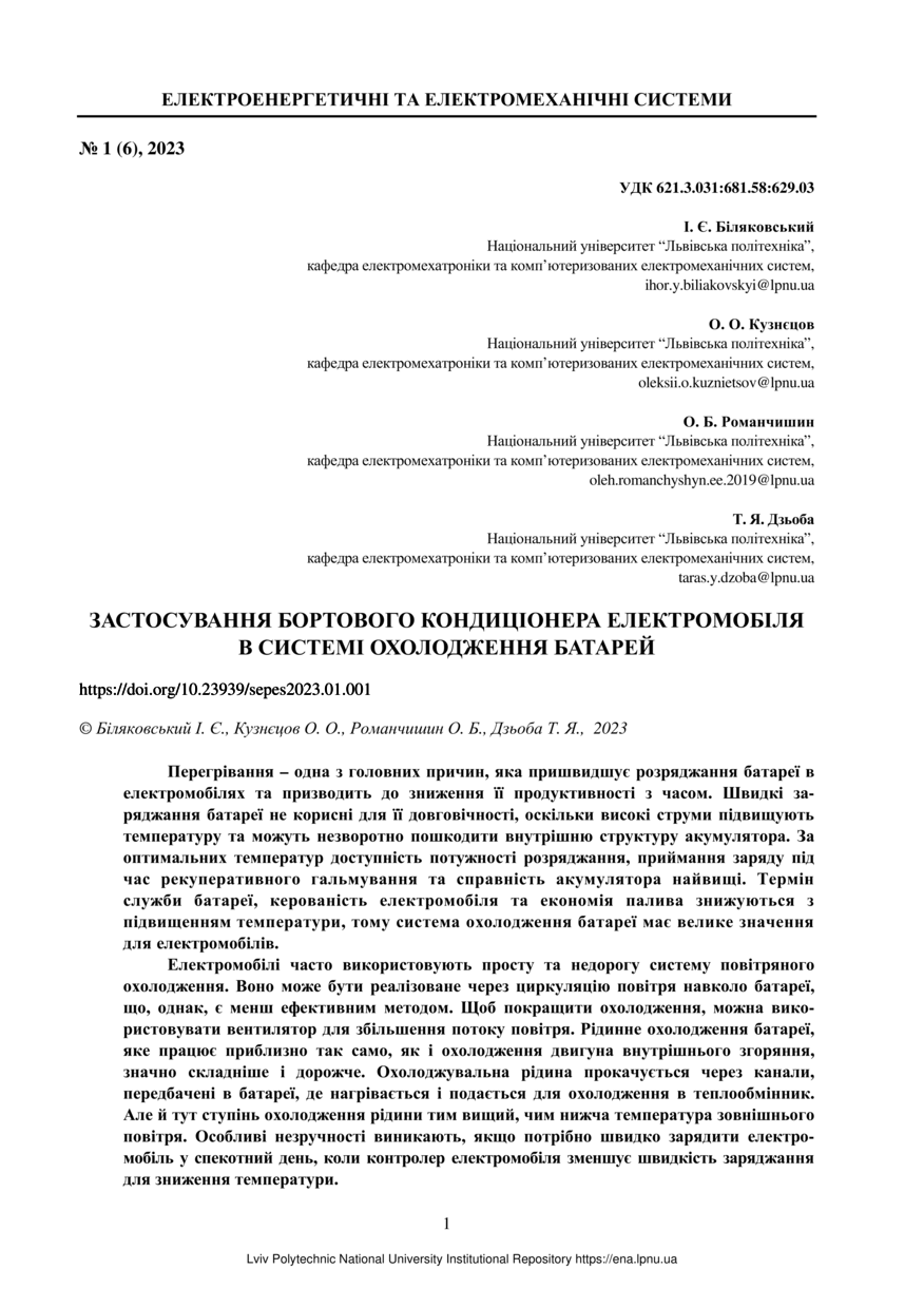 Застосування бортового кондиціонера електромобіля в системі охолодження батарей / Ігор Біляковський, Олексій Кузнєцов, О. Б. Романчишин, Т. Я. Дзьоба // Електроенергетичні та електромеханічні системи. — Львів : Видавництво Львівської політехніки, 2023. — Том 6. — № 1. — С. 1–11.