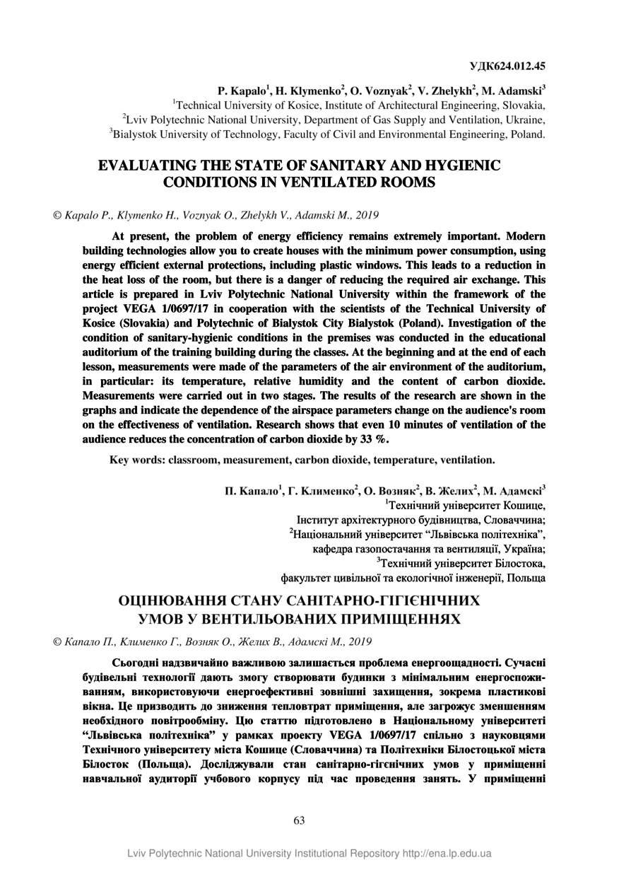 Evaluating the state of sanitary and hygienic conditions in ventilated rooms / P. Kapalo, H. Klymenko, O. Voznyak, V. Zhelykh, M. Adamski // Вісник Національного університету “Львівська політехніка”. Серія: Теорія і практика будівництва. — Львів : Видавництво Львівської політехніки, 2019. — № 912. — С. 63–67.