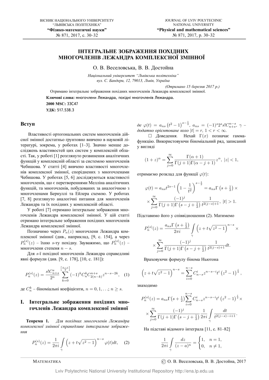 Веселовська О. В. Інтегральне зображення похідних многочленів Лежандра комплексної змінної / О. В. Веселовська, В. В. Достойна // Вісник Національного університету «Львівська політехніка». Серія: Фізико-математичні науки. — Львів : Видавництво Львівської політехніки, 2017. — № 871. — С. 30–32.