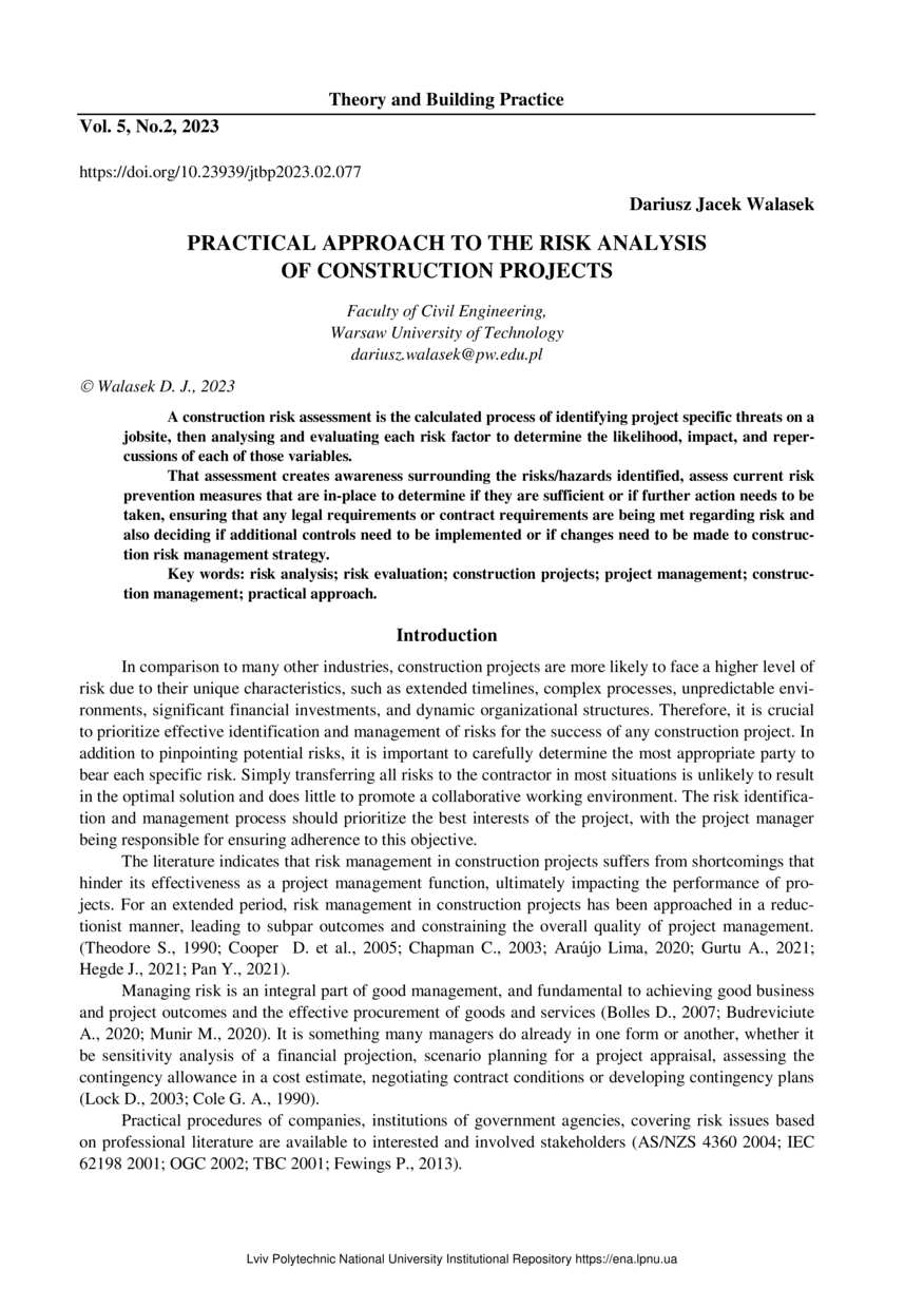 Walasek D. Ja. Practical approach to the risk analysis of construction projects / D. Ja. Walasek // Theory and Building Practice. — Lviv : Lviv Politechnic Publishing House, 2023. — Vol 5. — No 2. — P. 77–84.