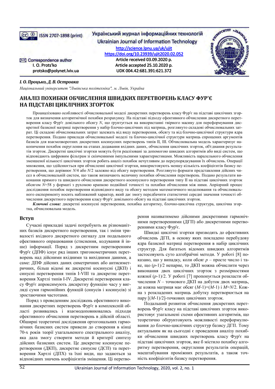 Процько І. О. Аналіз похибки обчислення швидких перетворень класу Фур'є на підставі циклічних згорток / І. О. Процько, Д. В. Островка // Український журнал інформаційних технологій. — Львів : Видавництво Львівської політехніки, 2020. — Том 2. — № 1. — С. 52–56.