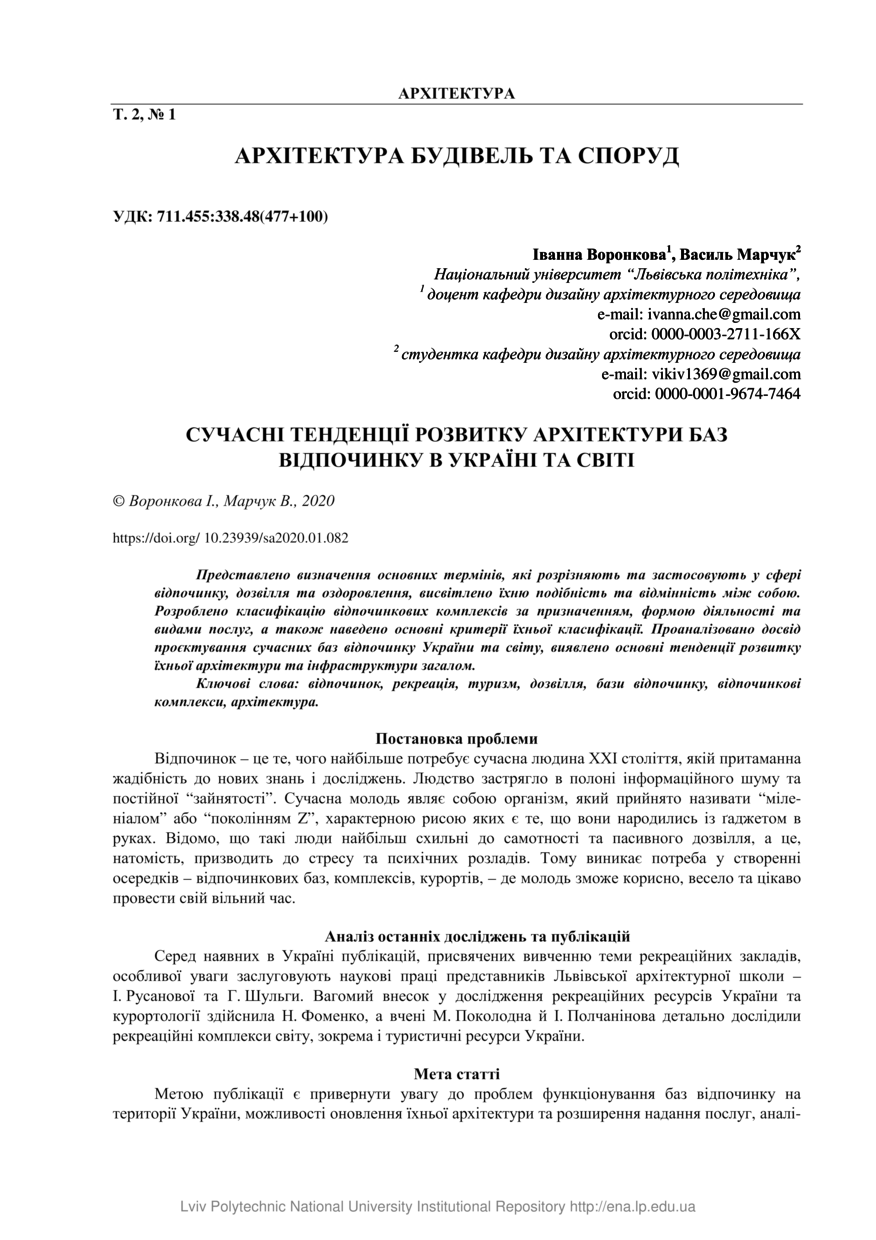 Воронкова І. Сучасні тенденції розвитку архітектури баз відпочинку в Україні та світі / Іванна Воронкова, Василь Марчук // Вісник Національного університету “Львівська політехніка”. Серія: Архітектура. — Львів : Видавництво Львівської політехніки, 2020. — Том 2. — № 1. — С. 82–88.
