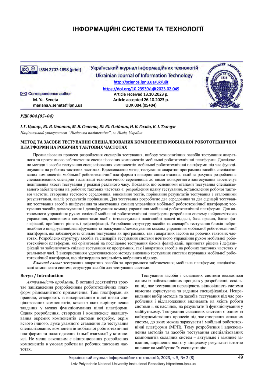 Метод та засоби тестування спеціалізованих компонентів мобільної робототехнічної платформи на робочих тактових частотах / І. Г. Цмоць, Ю. В. Опотяк, М. Я. Сенета, Ю. Ю. Олійник, Н. Б. Газда, К. І. Ткачук // Український журнал інформаційних технологій. — Львів : Видавництво Львівської політехніки, 2023. — Том 5. — № 2. — С. 49–59.