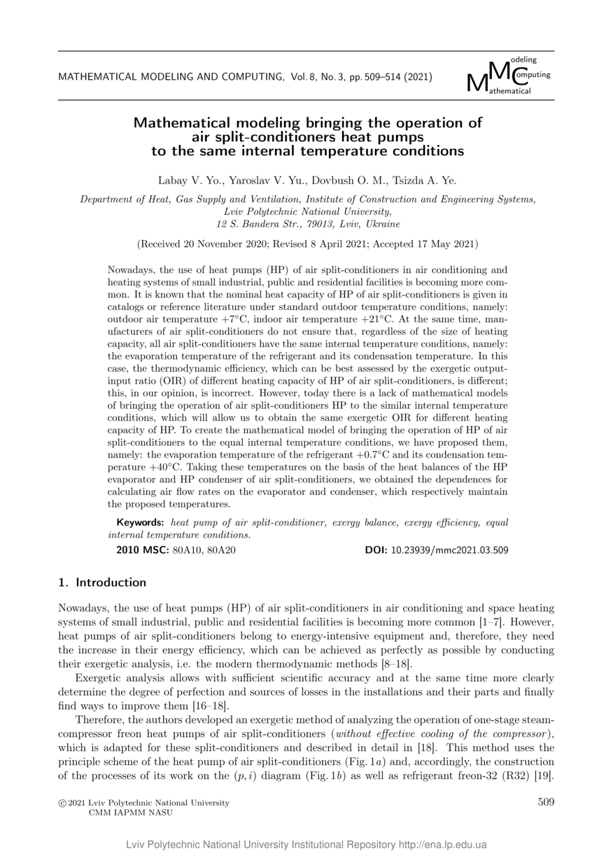 Mathematical modeling bringing the operation of air split-conditioners heat pumps to the same internal temperature conditions / V. Yo. Labay, V. Yu. Yaroslav, O. M. Dovbush, A. Ye. Tsizda // Mathematical Modeling and Computing. — Lviv : Lviv Politechnic Publishing House, 2021. — Vol 8. — No 3. — P. 509–514.