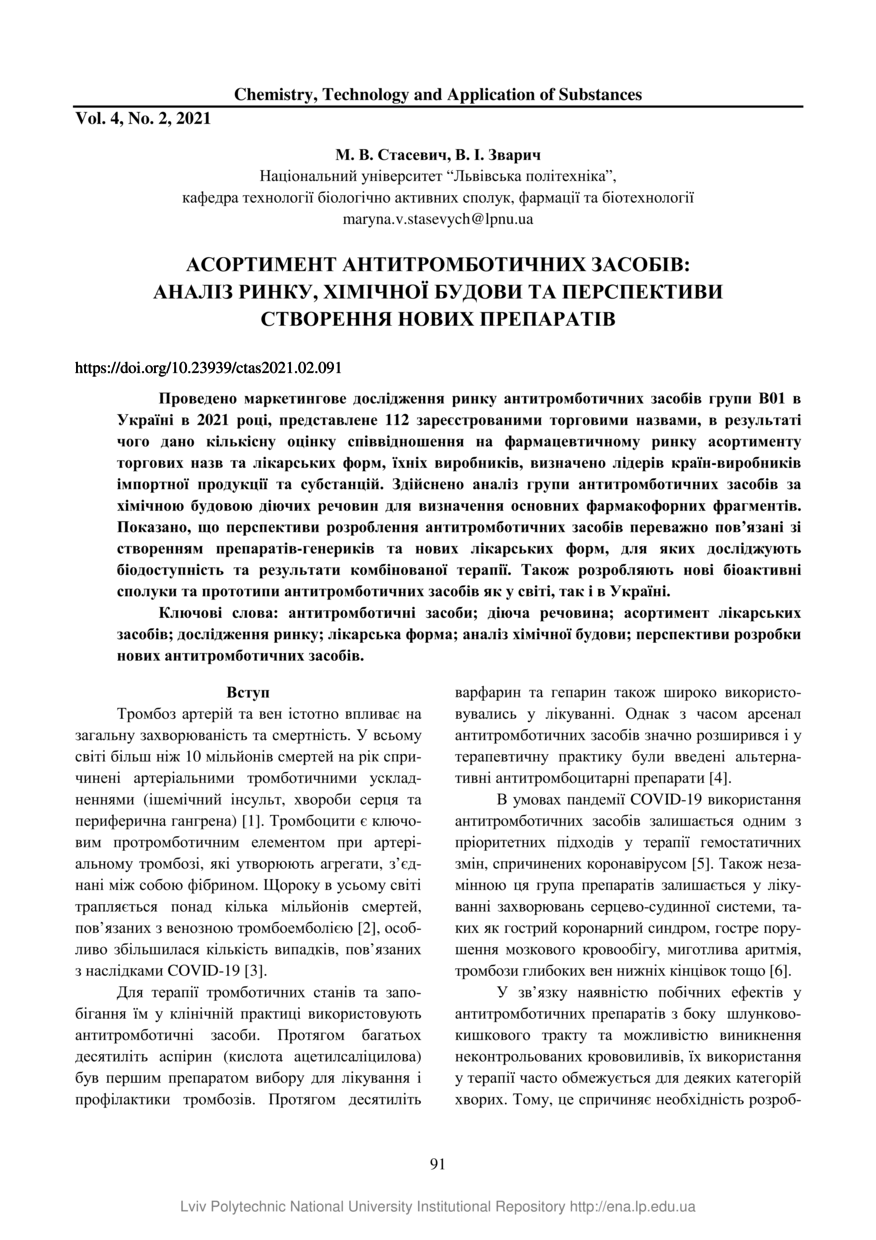 Стасевич М. В. Асортимент антитромботичних засобів: аналіз ринку, хімічної будови та перспективи створення нових препаратів / М. В. Стасевич, В. І. Зварич // Chemistry, Technology and Application of Substances. — Lviv : Lviv Politechnic Publishing House, 2021. — Том 4. — № 2. — С. 91–105.