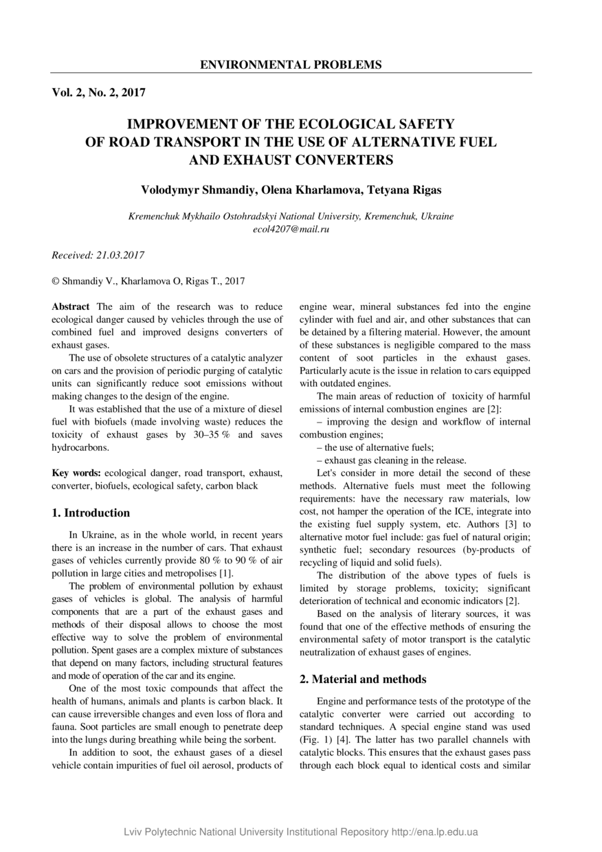 Shmandiy V. Improvement of the ecological safety of road transport in the use of alternative fuel and exhaust converters / Volodymyr Shmandiy, Olena Kharlamova, Tetyana Rigas // Environmental Problems. — Lviv : Lviv Politechnic Publishing House, 2017. — Vol 2. — No 2. — P. 55–58.