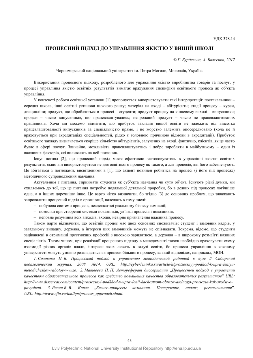 Бурдельна Г. Процесний підхід до управління якістю у вищій школі / Г. Бурдельна, А. Боженко // Управління якістю в освіті та промисловості: досвід, проблеми та перспективи : тези доповідей III Міжнародної науково-практичної конференції пам’яті професора Петра Столярчука, Львів, 11–12 травня 2017 року. — Львів : Видавництво Львівської політехніки, 2017. — С. 43. — (Управління якістю у сфері освіти, науки та промисловості).