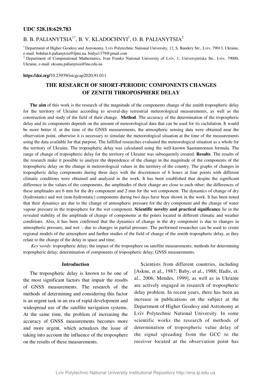 Palianytsia B. B. The research of short-periodic components changes of zenith throposphere delay / B. B. Palianytsia, B. V. Kladochnyi, O. B. Palianytsia // Geodesy, cartography and aerial photography. — Lviv : Lviv Politechnic Publishing House, 2020. — No 91. — P. 11–19.