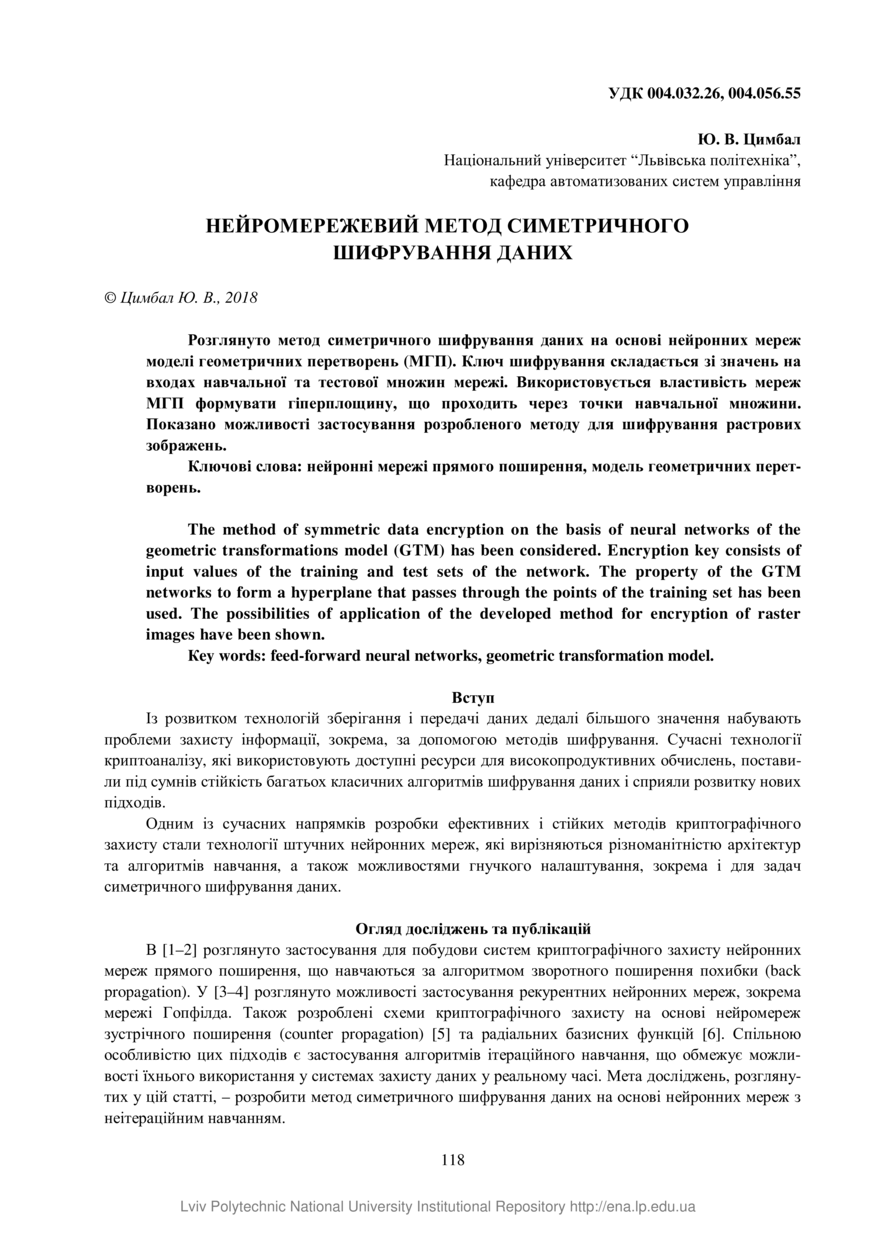 | dc.identifier.citation | Цимбал Ю. В. Нейромережевий метод симетричного шифрування даних / Ю. В. Цимбал // Вісник Національного університету “Львівська політехніка”. Серія: Інформаційні системи та мережі. — Львів : Видавництво Львівської політехніки, 2018. — № 901. — С. 118–122. — (Комп’ютерна та математична лінгвістика). | |