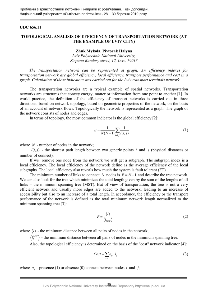 Zhuk M. Topological analisis of efficiency of transportation network (at the example of Lviv city) / Mykola Zhuk, Halyna Pivtorak // Проблеми з транспортними потоками і напрями їх розв’язання : тези доповідей ІІІ Всеукраїнської науково-теоретичної конференції, 28 – 30 березня 2019 року, Львів. — Дрогобич : Посвіт, 2019. — С. 50–51. — (УПравління розвитком транспорних систем, безпекою та організацією руху).