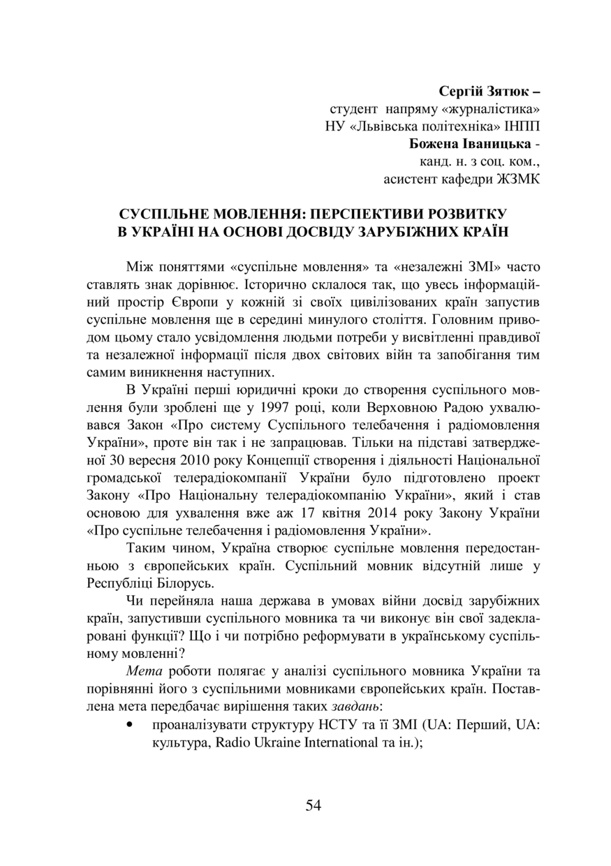 Зятюк С. Суспільне мовлення: перспективи розвитку в Україні на основі досвіду зарубіжних країн / Сергій Зятюк, Божена Іваницька // Проблеми журналістики: вчора, сьогодні, завтра :збірник матеріалів I Міжнародної наукової онлайн-конференції студентів та молодих дослідників, 4 квітня 2019 року, Львів. — Lviv : Видавництво Львівської політехніки, 2019. — P. 54–58.