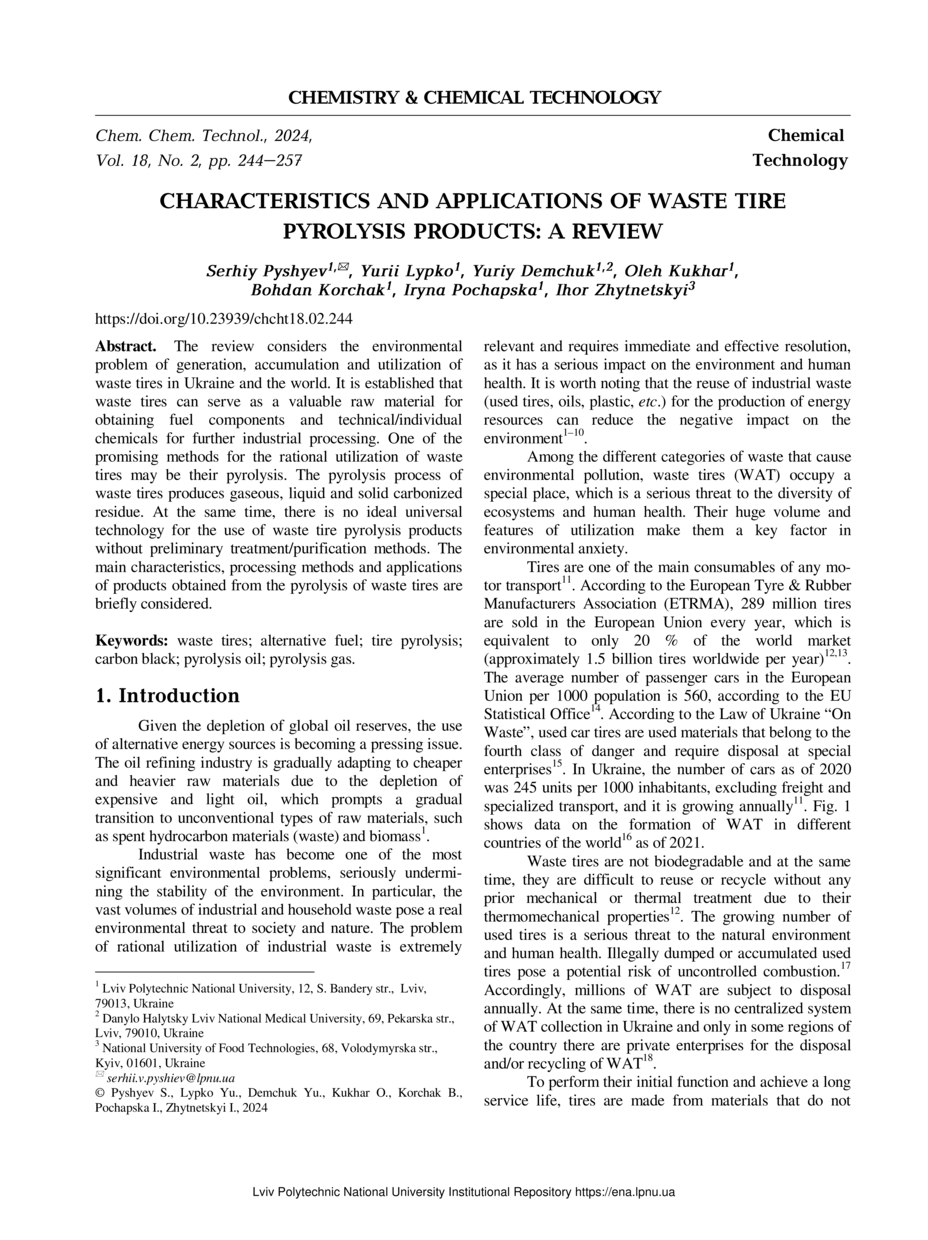 Characteristics and Applications of Waste Tire Pyrolysis Products. A Review / Serhiy Pyshyev, Yurii Lypko, Yuriy Demchuk, Oleh Kukhar, Bohdan Korchak, Iryna Pochapska, Ihor Zhytnetskyi // Chemistry & Chemical Technology. — Lviv : Lviv Politechnic Publishing House, 2024. — Vol 18. — No 2. — P. 244–257.