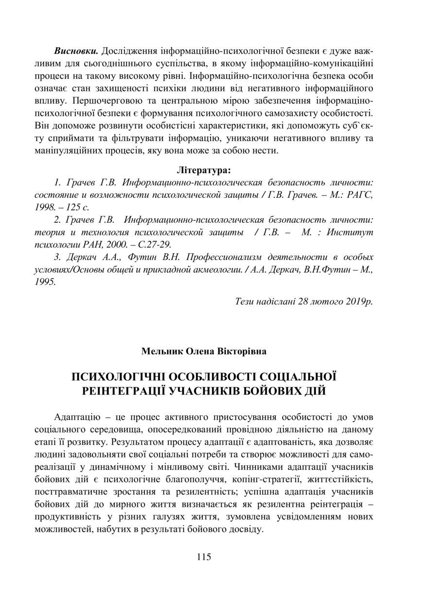 Мельник О. В. Психологічні особливості соціальної реінтеграції учасників бойових дій / Олена Вікторівна Мельник // Психологія національної безпеки і благополуччя особистості : тези І Міжнародної науково-практичної конференції, 14–15 березня 2019 року, Львів. — Львів : Видавництво Львівської політехніки, 2019. — С. 115–118.