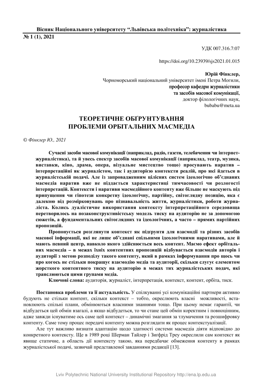 | dc.identifier.citation | Фінклер Ю. Теоретичне обґрунтування проблеми орбітальних масмедіа / Юрій Фінклер // Вісник Національного університету “Львівська політехніка” : журналістика. — Львів : Видавництво Львівської політехніки, 2021. — Том 1 (1). — С. 15–19. | |